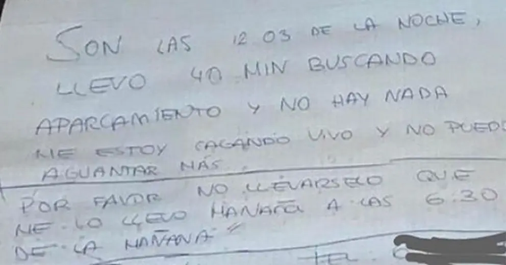 A boli y con un folio, el gaditano dejó una nota que rápidamente se ha hecho viral en las redes sociales en la que se puede leer: "Son las 12.03 de la noche, llevo 40 minutos buscando aparcamiento y no hay nada. Me estoy cagando vivo y no puedo aguantar más. Por favor, no llevárselo, que me lo llevo mañana a las 6.30 de la mañana".