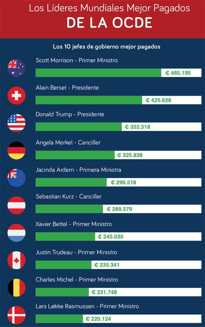 Si lo comparamos con los líderes mundiales mejor pagados de la OCDE, el sueldo de Sánchez no es muy elevado. Los pocos más de 80.000 euros que se embolsa anualmente se antojan una suma modesta en comparación con los 465.195 € que cobra el primer ministro australiano, Scott Morrison, o los 352.518 € que cobra el siempre controvertido presidente estadounidense, Donald Trump. Pero es que incluso el sueldo de Pedro Sánchez es pequeño en comparación con el del décimo puesto de la lista: el primer ministro danés, Lars Løkke Rasmussen, cobra 220.124 €.
