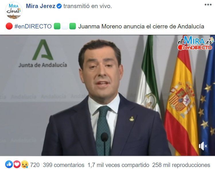 La intervención de Juanma Moreno en el que anunció el presidente el cierre de Andalucía ha sido retransmitida en directo por Facebook Live de El MIRA; logrando alcanzar más de medio millón de personas. En concreto la publicación ha sido visto por 540 mil personas alcanzadas, siendo el vídeo reproducido 260 mil veces. Los seguidores de los diferentes MIRA de Andalucía han llevado a cabo 114.403 interacciones entre me gustas, comentarios y compartidos del post.