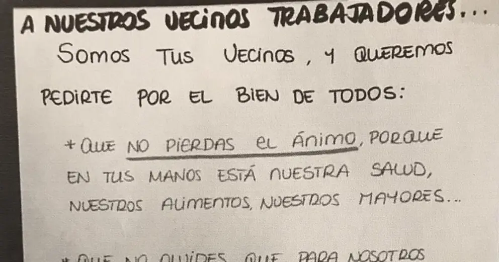 En el mensaje, recogido por un usuario de Twitter, se invita a los vecinos trabajadores a no perder el ánimo porque “en tus manos está nuestra salud, nuestros alimentos o nuestros mayores”.