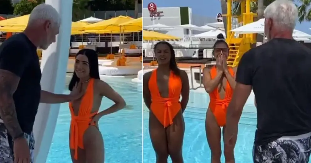 Antes de comenzar este hombre se pone gel hidroalcohólico en las manos, para así evitar cualquier riesgo de contagio de coronavirus, en tanto a las chicas que va descartando le da un empujón para tirarlas al agua.