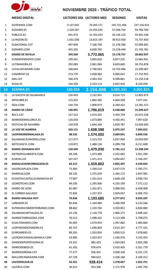 Con estos números, elMIRA.es se sitúa en visitantes mensuales en el puesto 2º de Andalucía y 14º de España dentro de los medios de comunicación de noticias e información generalista según OJD.