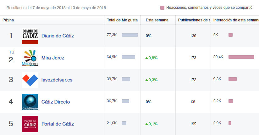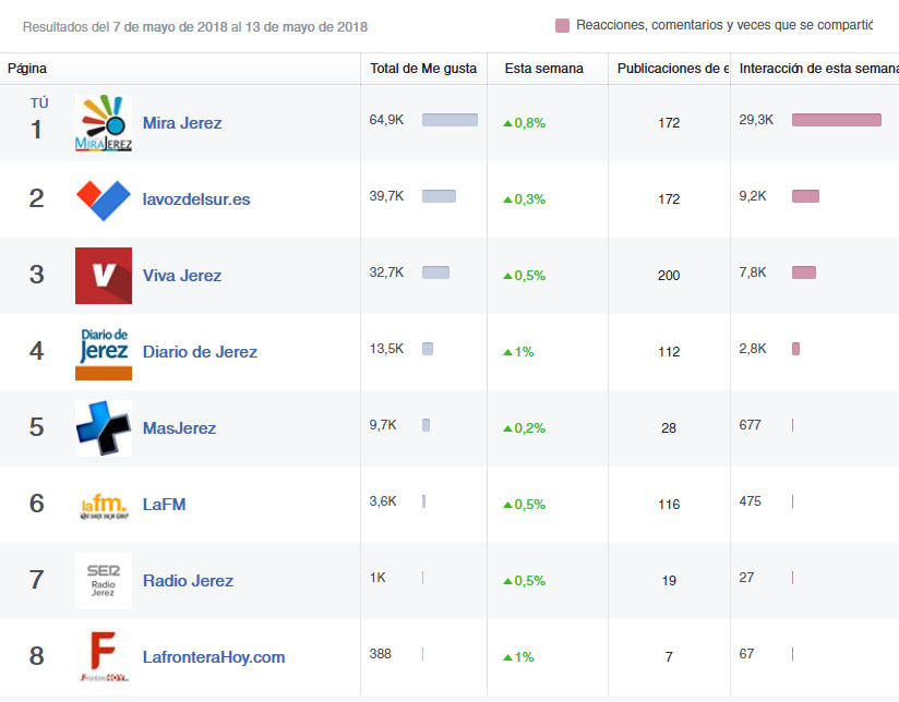 MIRA Jerez sigue siendo el medio día tras día que logra mayor número de interacciones en sus redes sociales, tanto en la localidad jerezana como a nivel provincial, como se puede ver en la comparativa siguiente.