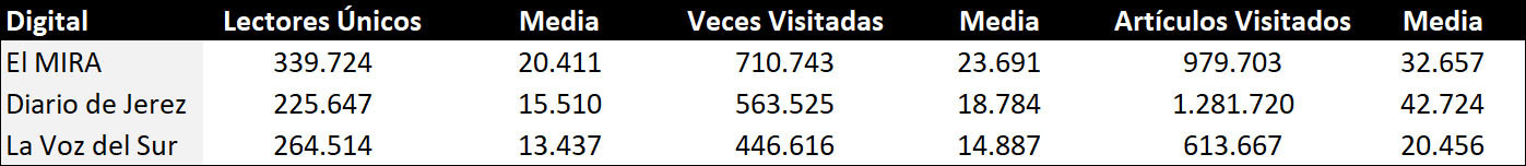 En el estudio, que abarca dispositivos móviles y PC, los lectores del MIRA han visitado un total de 710.743 veces la web, cifras que establecen un margen de ventaja con respecto a la edición online de El Diario de Jerez, que alcanza los 563.525 veces, o a una distancia aún mayor el digital de LVS, con 446.616. Las noticias de última hora, los reportajes, las informaciones en exclusiva y las opiniones de autores han conseguido hacer de Mira Jerez el diario digital líder en la ciudad, y de elMIRA.es el segundo en este apartado, tras también los datos del Diario de Cádiz.
