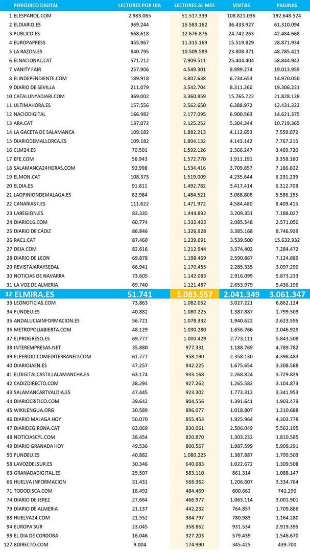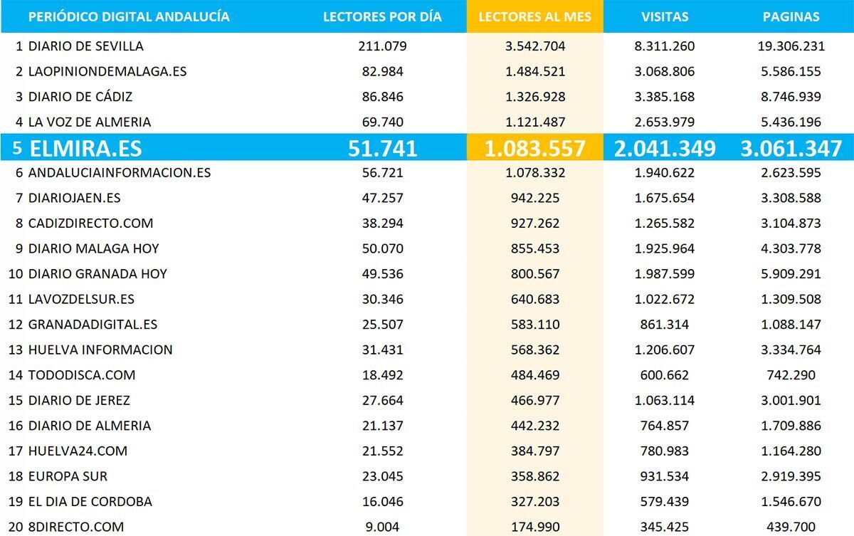 El digital elMIRA.es ocupa el puesto 32 entre los medios de Noticias e Información auditados por OJD, continuando así en el Top 50 de los principales medios del país en un ranking que lidera El Español, y cuyo primer puesto de un medio andaluz es el 9 con Diario de Sevilla, y el segundo en el lugar 21, Opinión de Málaga.