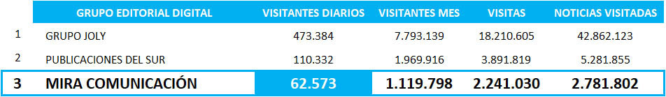 Respecto a los grupos editoriales en Andalucía, MIRA Comunicción sigue en tercer lugar con más de 62 mil lectores diarios, siguiendo la estela de Publicaciones del Sur con periódicos digitales en toda Andalucía, y del Grupo Joly. Así, el Grupo MIRA Comunicación suma un total de 1.119.798 visitantes diferentes en el mes, quienes han realizado un total de 2.241.030 visitas, llegando a ver 2.781.802 noticias.