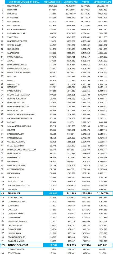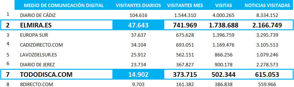 elMIRA.es ha tenido una media de 47.643 lectores diferentes al día, siendo el total del mes de 741.969 visitantes únicos, quienes han realizado un total de 1.738.688 visitas en las que han leído 2.166.749 artículos. Entre los medios afincados en Jerez, la vozdelSur.es se sitúa inmediatamente por detrás, con 25.912 lectores, por encima del Diario de Jerez con 23.734 y de Tododisca con 14.902.