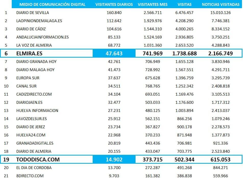 El digital elMIRA.es ocupa el puesto 49 entre los medios de Noticias e Información auditados por OJD, entrando así en el Top 50 de los principales medios del país en un ranking que lidera El Español, y cuyo primer puesto de un medio de Sevilla es el 14 con Diario de Sevilla, y el 23 para el Diario de Cádiz. En este listado, el digital lavozdelsur.es ocupa el puesto 84 y el Diario de Jerez el 86, entrando ambos en el Top 100.