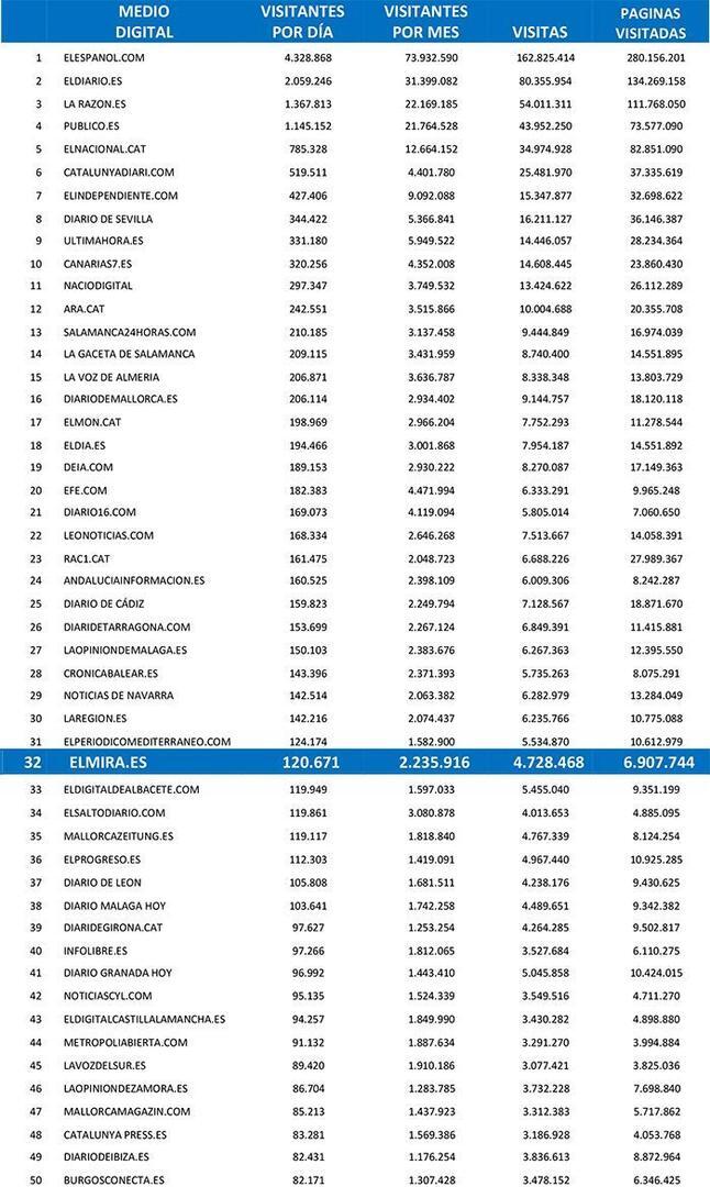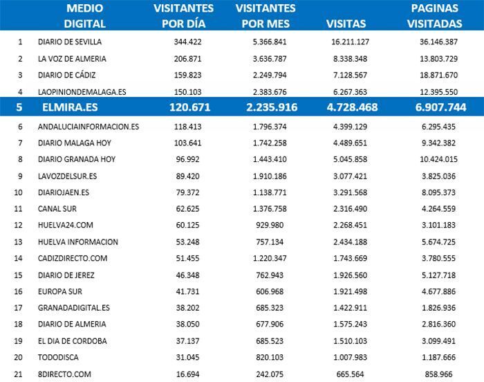 El digital elMIRA.es ocupa el puesto 32 entre los medios de Noticias e Información auditados por OJD, continuando así en el Top 50 de los principales medios del país en un ranking que lidera El Español, y cuyo primer puesto de un medio andaluz es el 8º con Diario de Sevilla, y el segundo en el lugar 15º, La Voz de Almería.