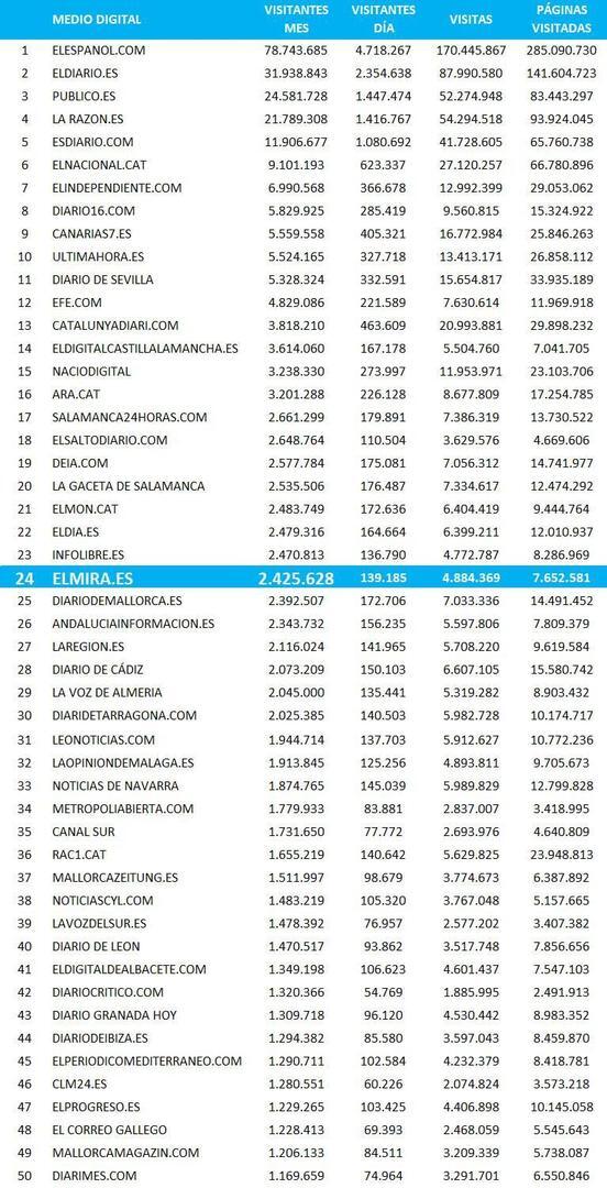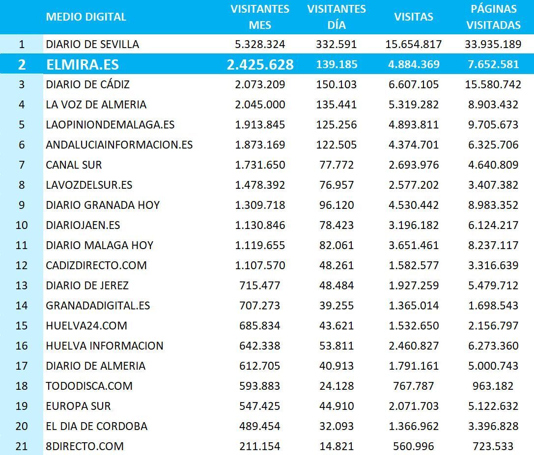El digital elMIRA.es ocupa el puesto 24 entre los medios de Noticias e Información auditados por OJD, continuando así en el Top 50 de los principales medios del país en un ranking que lidera El Español, y cuyo primer puesto de un medio andaluz es el 11º con Diario de Sevilla. A continuación de El MIRA se encuentran Andalucía Información en el 26º, Diario de Cádiz en el 28º y La Voz de Almería en el 29º.