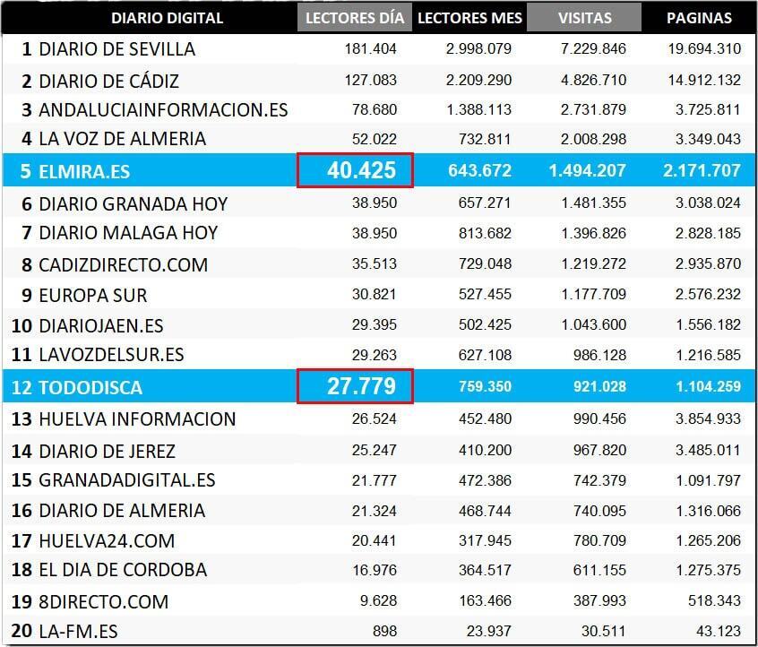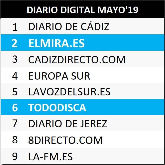 Las diferentes cabeceras del Grupo MIRA en elMIRA.es y sus digitales asociados logran afianzarse aumentando sus cifras en lectores, visitas y páginas visitadas cada mes. El periódico elmira.es se coloca, según los datos de audiencia de mayo, quinto en Andalucía entre los diarios digitales auditados por la Oficina de Justificación de la Difusión (OJD), segundo en la provincia de Cádiz y primero de Jerez, en número de lectores diferentes al día y al mes. Además Tododisca.com, medio dedicado al mundo de personas con discapacidad con mayor difusión en el mundo de habla hispana y perteneciente al GRUPO MIRA, se coloca en el puesto doceavo de Andalucía, y sexto en la provincia de Cádiz.