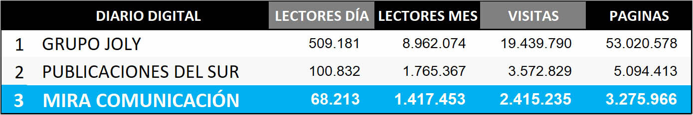Según datos auditados por la Oficina de Justificación de la Difusión, el crecimiento de MIRA Comunicación, lo convierte por números propios y nivel de difusión en el tercer grupo editorial digital de Andalucía, tan solo por detrás de Grupo Joly y Publicaciones del Sur (Andalucía Información, periódicos VIVA), a pesar de tan solo tener en la actualidad presencia en las provincias de Cádiz y de Sevilla, respecto a ambos grupos, con cabeceras en casi la totalidad de las provincias andaluzas. En el mes de mayo, más de 68 mil personas diferentes al día han leído publicaciones del Grupo MIRA, siendo el total de lectores únicos de 1.417.453, quienes han entrado en el digital un total de 2.415.235 de veces, visitando un total de 3.275.966 noticias.