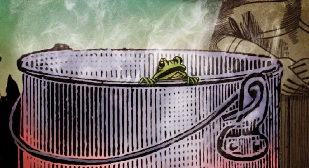 La premisa es que si una rana se pone repentinamente en agua hirviendo saltará, pero si la rana se pone en agua tibia que luego se lleva a ebullición lentamente no percibirá el peligro y se cocerá hasta la muerte. La historia se usa a menudo como una metáfora de la incapacidad o falta de voluntad de las personas para reaccionar o ser conscientes de las amenazas siniestras que surgen gradualmente en lugar de hacerlo de repente.