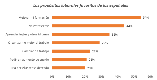 Los más frecuentes son mejorar la formación – con algún curso de reciclaje o de nuevas herramientas, entre otros -, con un 54%; no estresarse (44%) y aprender inglés u otros idiomas (35%). En este sentido, también merece especial atención el hecho de que un 23% se propone cambiar de trabajo con el fin de encontrar una oportunidad laboral que les permita crecer a nivel profesional.