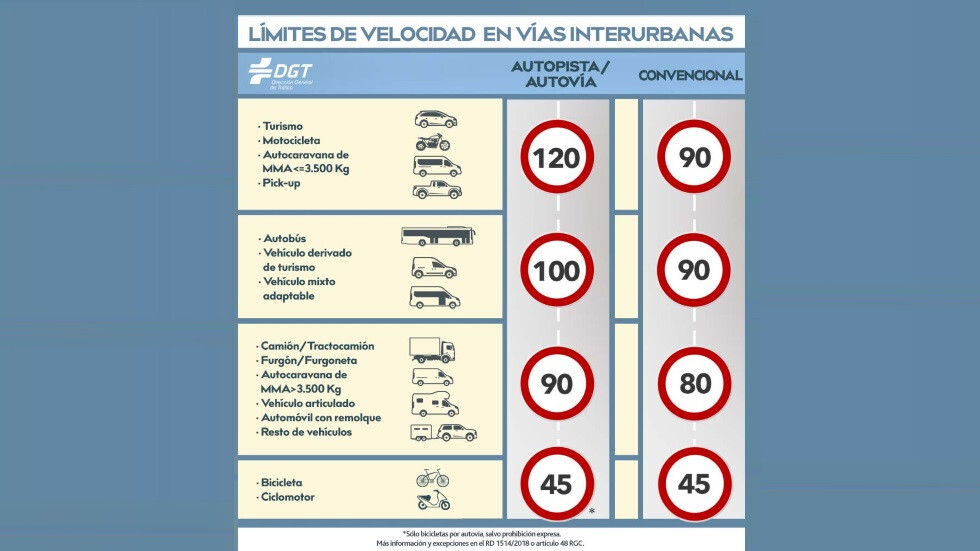En el caso de bicicletas y ciclomotores, la DGT especifica que nunca podrán superar los 45 km/h, con la excepción de que las bicicletas solo podrán circular por autovías, salvo prohibición expresa.