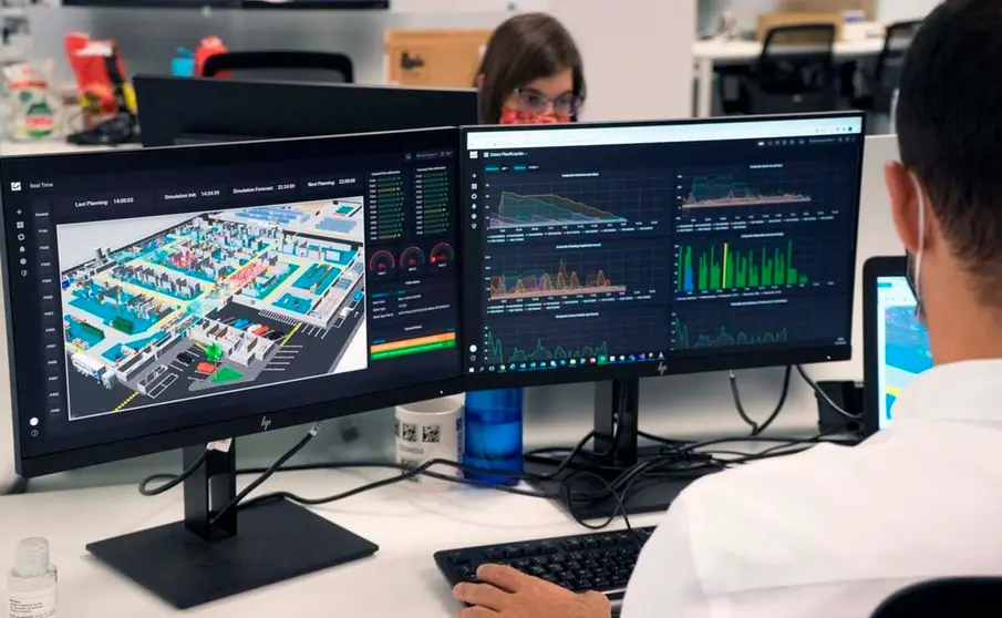 Esta representación virtual envía la información en tiempo real al tablero de mandos, en una pantalla que reproduce toda la fábrica y sus elementos, desde donde se pueden tomar las decisiones correctas. Esta tecnología de recreación virtual se utiliza mucho en la Formula 1 para probar las distintas configuraciones de un monoplaza en un entorno virtual para ganar tiempo y ahorrar dinero.