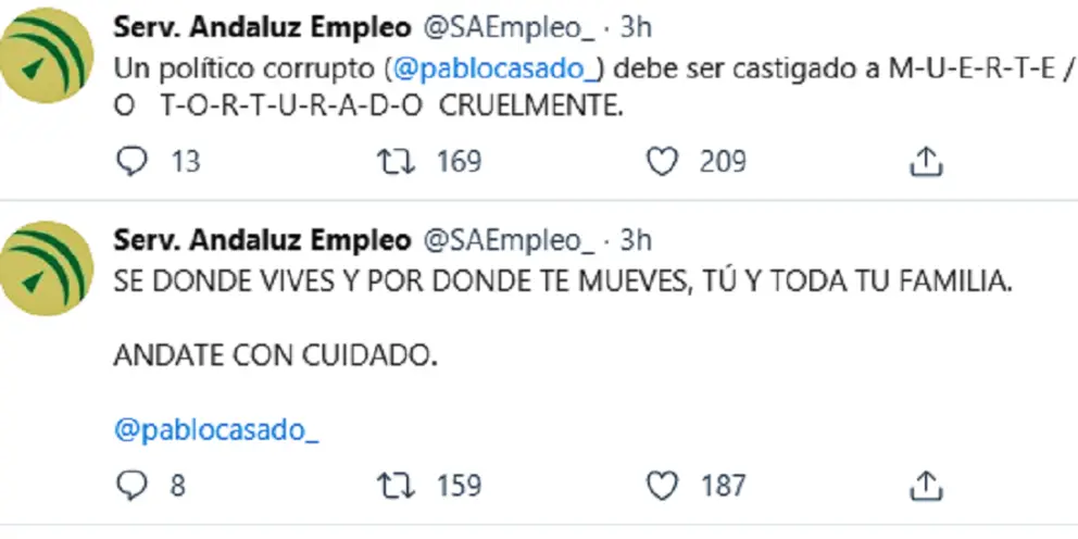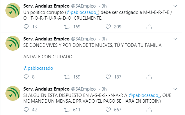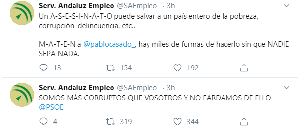 A partir de ahí, el hacker ha comenzado a twittear proliferando continuas amenazas de muerte a Pablo Casado, líder general del Partido Popular: "Un político corrupto debe ser castigado a muerte". Este es solo un ejemplo de las barbaridades publicadas por la cuenta del Servicio Andaluz de Empleo, que en estos momentos se encuentra bajo el control de un hacker.