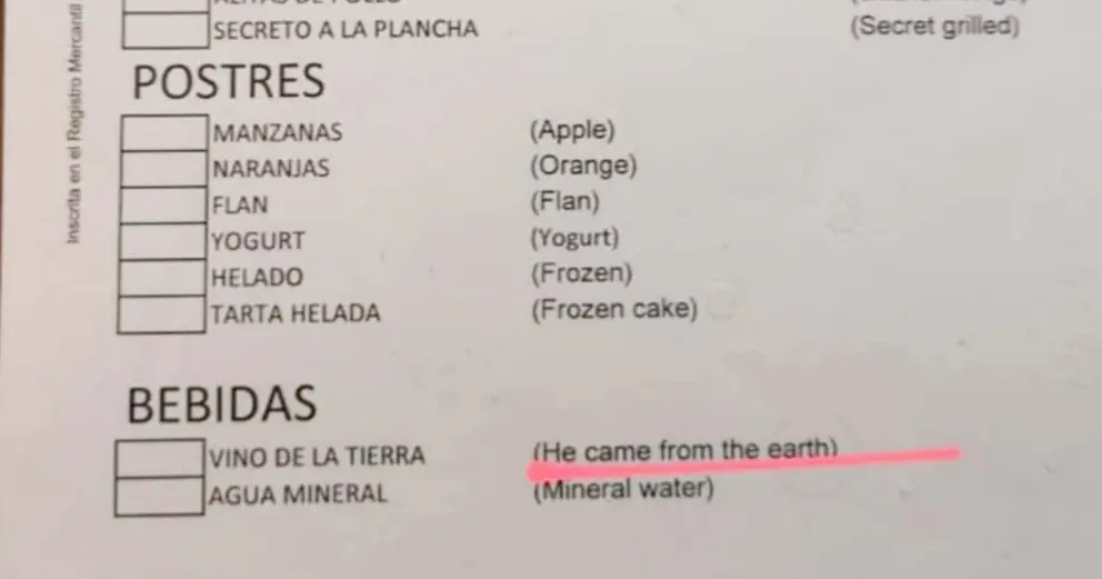 Entre tanto suceso trágico como nos ofrece a diario la actualidad más oficial, siempre ha de agradecerse una noticia que al menos produzca una risa en el público. En los oyentes, en los espectadores, en los lectores. Y es que a decir verdad las bromas sobre las traducciones de las cartas de restaurante ya tienen una categoría propia, ya tienen referente propio, dentro de Twitter. Un ejemplo más es el de un restaurante de Cáceres que ha subido la usuaria @RocioSomeday. Y que se ha extendido como la pólvora. Como una gota de aceite.