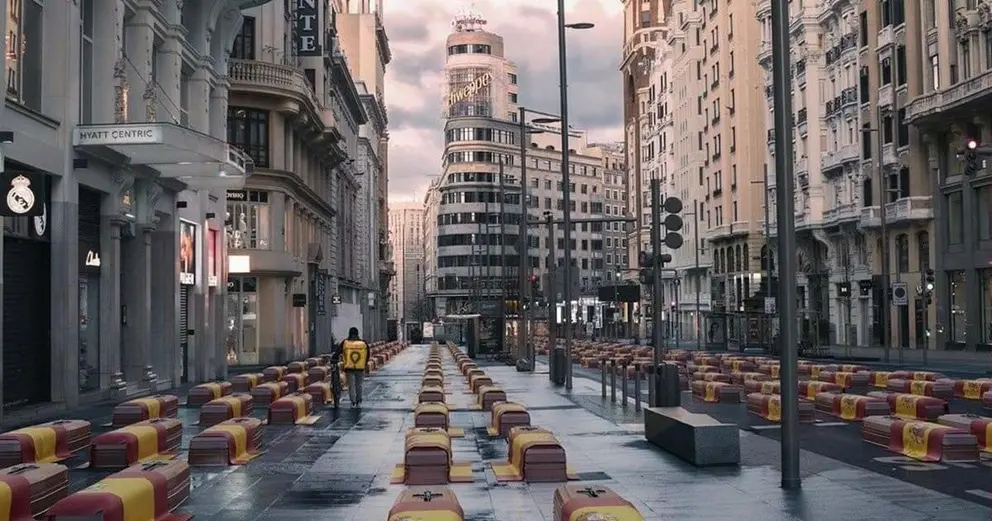En este caso se trata de una imagen de la Gran Vía madrileña repleta de ataúdes cubiertos con una bandera de España. En medio del fotomontaje, un repartido de comida a domicilio con su característica mochila amarilla a la espalda.
