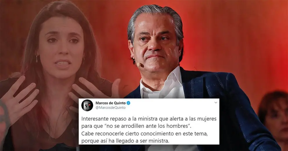 Su mensaje iba acompañando a un artículo de 'Vozpópuli' sobre la ministra de Igualdad, Irene Montero. De Quintos comentaba el artículo: "Interesante repaso a la ministra que alerta a las mujeres para que 'no se arrodillen ante los hombres'. Cabe reconocerle cierto conocimiento en este tema, porque así ha llegado a ser ministra".