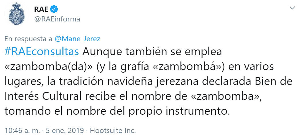 La Real Academia de la Lengua Española, tras haber manifestado en una respuesta a un usuario de Twitter que se deberá decir 'zambombá' y no 'zambomba' a la tradicional fiesta navideña, especificó finamente que la fiesta jerezana se dice "zambomba".