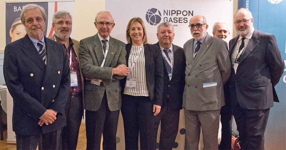 De izquierda a derecha, Dr. Alessandro Marroni, Cofundador y Vicepresidente del European Committe for Hyperbaric Medicine (ECHM) en Italia, Dr. José María Inoriza, Hospital de Palamós en Girona, Dr. Emilio Salas, Médico especialista en Medicina Hiperbárica en San Fernando, Cádiz, Eva María Sanz, Presidenta de la ASEMHS, Dr. José Antonio Viqueira, Jefe de Servicio de Medicina Hiperbárica del Hospital de la Caridad en Cartagena (Murcia), Dr. Jordi Desola, Cofundador y Miembro del Comité Ejecutico del ECHM en Barcelona, Miguel Brinquis, Experto en OHB del Hospital Gómez Ulla y Dr. Manuel Salvador, Jefe de Medicina Hiperbárica del Hospital General de Castellón
