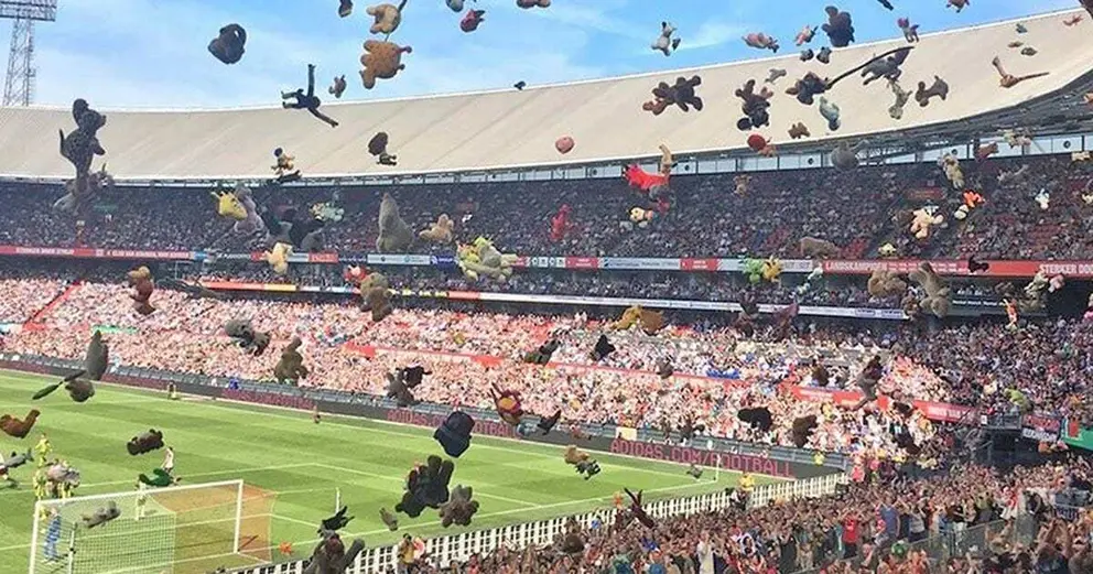 Cada vez que el Ado Den Haag visita al Feyenoord en partido correspondiente a la Eredivisie, Liga Holandesa de Fútbol, se realiza una espectacular ‘lluvia’ de peluches.