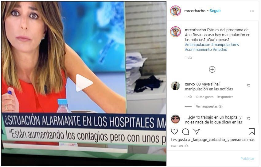 A Mr Corbacho son muchos los seguidores en esta red social que le responden afirmativamente: "Yo trabajo en un hospital y no es nada de lo que dicen en las noticias"; "Es que no enseñan ni los muertos que dicen que mueren"; "Manipulación tanto en Ana Rosa como en los demás, que asco de 'periodismo'"; "Manipulación absoluta, y ni darán la cara por lo que hacen"; "Te caes por la calle, te pegas con el borde de la acera y te mueres... Oh, ¡Murió por coronavirus!".