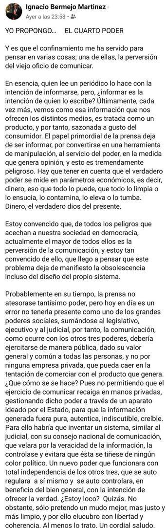 Ignacio Bermejo Martínez, destacado miembro del PSOE, séptimo teniente de alcaldesa del municipio gaditano de San Fernando y delegado del área de Desarrollo Sostenible, en un pormenorado análisis crítico en su cuenta oficial de Facebook, aboga para que la información no recaiga en medios de comunicación privados (cuyo deber es el de controlar la gestión de los gobernantes), sino que sea el propio Estado quien desarrolle un aparato que controle la información que debe llegar a los ciudadanos, una única información, un único punto de vista.