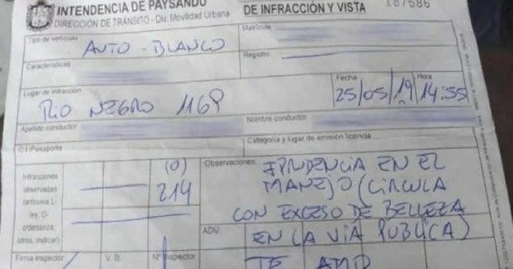 Tal cual se lee. Un agente de tráfico, un oficial en toda regla, de la mencionada ciudad uruguaya, ha multado a una conductora por ser demasiado guapa y, a tenor de su atractivo, podía causar la distracción del resto de los conductores. No se trata de una broma pesada. No se trata de un bulo de cámara oculta. Nos se trata de una noticia falsa.