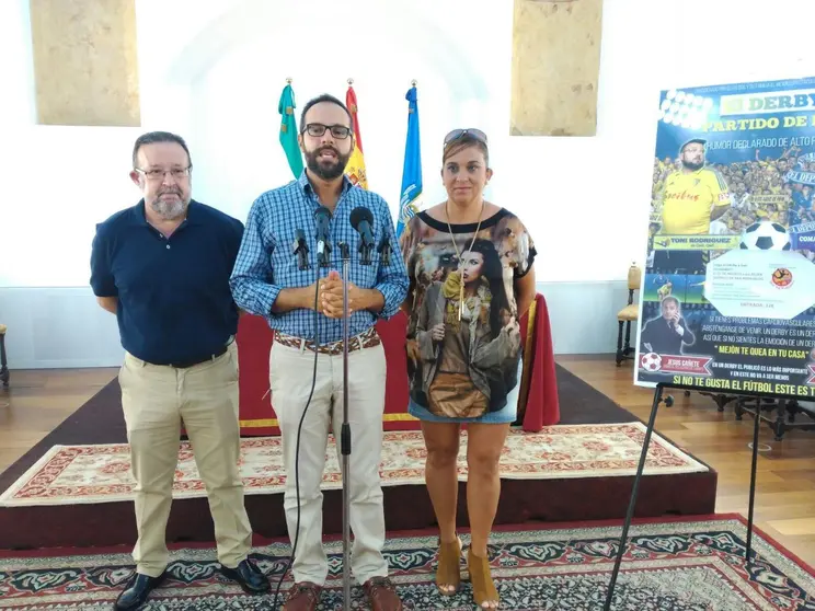 El delegado municipal de Cultura, Juanjo Carrera, y el presidente del Club Balonmano de San Fernando, Pedro Montiel, han presentado esta mañana en el Castillo de San Romualdo el espectáculo humorístico Derby 'Partido de Ida', que se representará el próximo día 25 de agosto, a partir de las 20.00 horas, en este espacio. En este show Toni Rodríguez y el Comandante Lara representan a las aficiones de fútbol gaditana y Jerezana, respectivamente, y mantienen un particular enfrentamiento mediante monólogos de humor. Este derby tan especial contará con Jesús Cañete como delegado de campo y con Vicente Ruidos como colegiado.