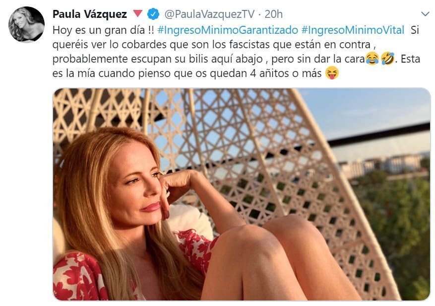 Sin embargo, Paula Vázquez deduce que hay personas en contra de tal medida y que por tanto son cobardes y fascistas. Su mensaje no tiene desperdicio:"Hoy es un gran día! #IngresoMinimoGarantizado #IngresoMinimoVital Si queréis ver lo cobardes que son los fascistas que están en contra, probablemente escupan su bilis aquí abajo, pero sin dar la cara. Esta es la mía cuando pienso que os quedan 4 añitos o más".