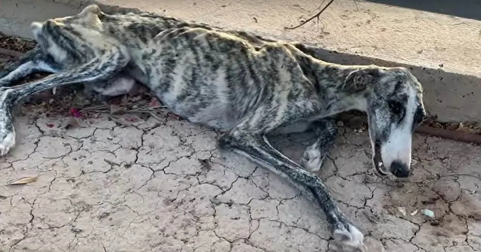 Abandonada en la calle una perra desnutrida, moribunda y llorando de dolor
