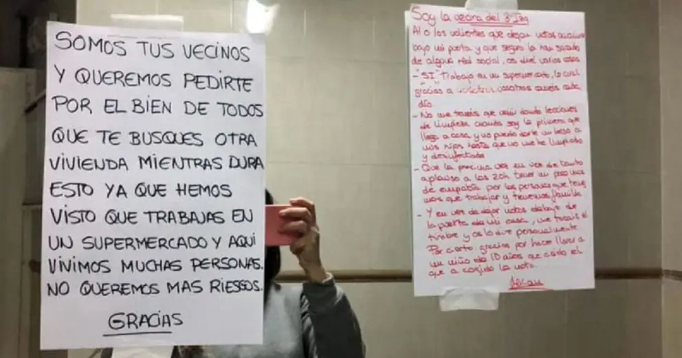 Miriam, desde Cartagena, cuenta que, hace unos días, su hijo, de diez años, se encontró con una nota, sin firmar. En ella, sus vecinos le piden que se marche de su casa por trabajar en un supermercado, ya que no quieren "más riesgos".