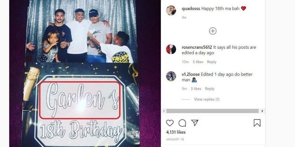 Una de las imágenes que se está usando para decir que tiene 18 años es una de una celebración de cumpleaños publicada en Instagram. Sin embargo, en otra fotografía del momento se ve como Quaden felicita a un amigo por su 18 cumpleaños con la frase «Happy 18th ma bah». No es su cumpleaños. Además, en el cartel aparece el nombre de Garlen, no Quaden.