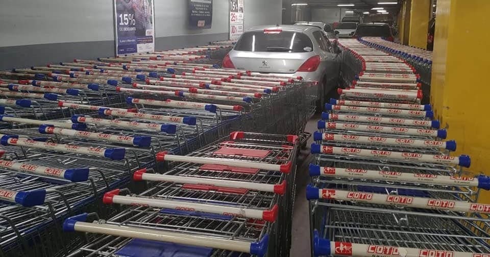 En la imagen publicada en su muro, y que se ha hecho viral en pocos días, se ve como un coche de color gris se encuentra totalmente rodeado de carros de la compra.