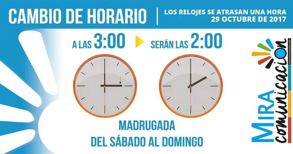 Como consecuencia del ahorro energético, a final de cada mes de octubre toca retrasar el reloj para adaptarnos al horario otoñal, previo a la llegada del invierno. Será en la madrugada del sábado 28 al domingo 29 de octubre de 2017. En esta ocasión, a las 03:00 horas de la madrugada serán las 02:00.