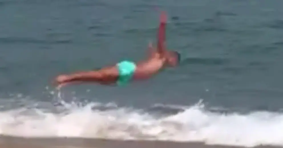 Salto mortal para meterse en el agua en una playa gaditana