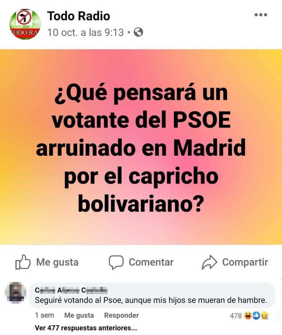 Un mensaje sobre los extremos a los que llega el fanatismo político está recorriendo las redes sociales y se está difundiendo por Whatsapp. Se trata a la respuesta a la que hace un internauta en la cuenta oficial de Facebook de Todo Radio. En una de sus publicaciones se pregunta la cual pregunta: "¿Qué pensará un votante del PSOE arruinado en Madrid por el capricho bolivariano?". La respuesta de uno de sus seguidores no ha dejado nadie indiferente: "Seguiré votando al PSOE, aunque mis hijos se mueran de hambre".