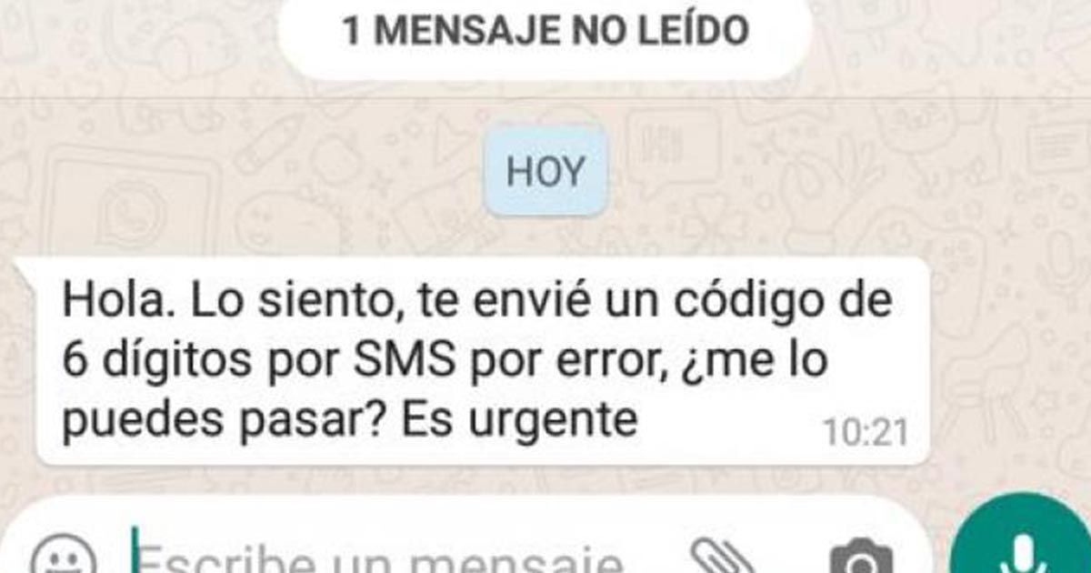 Se trata de una estafa de phishing, un método que comienza a verse también en Whatsapp: "Hola. Lo siento, te envié un código de 6 dígitos por SMS por error, ¿me lo puedes pasar? Es urgente", reza el mensaje de la estafa.