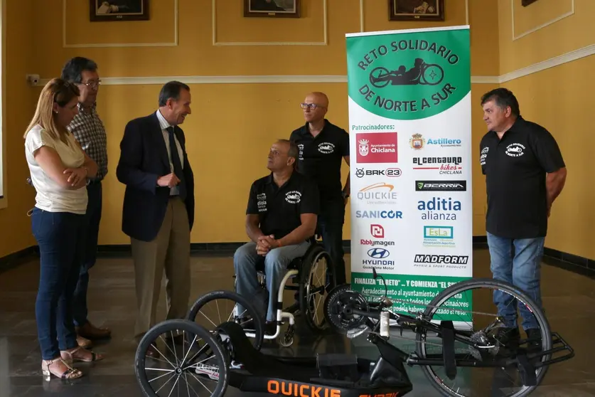 La delegada municipal de Salud, Mª Ángeles Martínez Rico; los deportistas Rafi Muñoz, Juan Rivera y Kiko Lobatón y el presidente de la Asociación Amigos de El Astillero (Cantabria), Manuel Rodríguez, han presentado el reto ‘España de Norte a Sur por el Deporte Adaptado’, que protagonizará en pocos días Rafi Muñoz, acompañado de Juan Rivera y de Kiko Lobatón. Se trata de cruzar el país, una iniciativa que el deportista chiclanero afrontará el próximo lunes 29 de mayo y que está prevista que finalice el 8 de junio, siendo ésta la primera vez que se intentará recorrer la geografía española de norte a sur en el deporte adaptado.