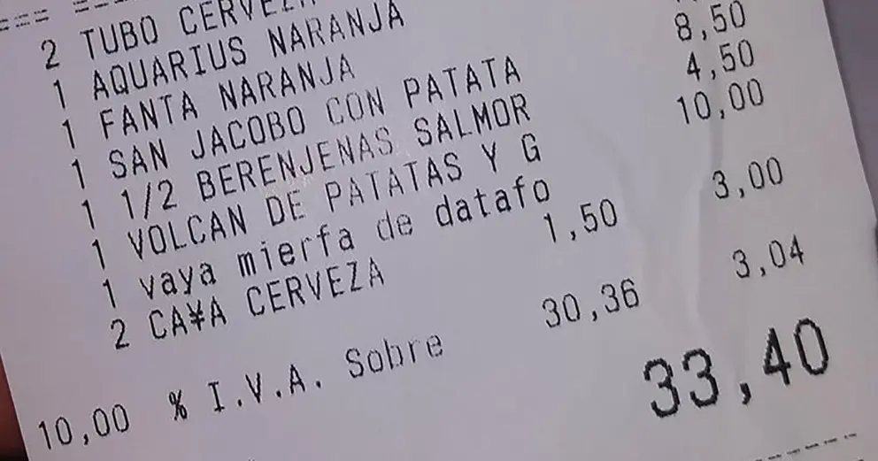 El ticket en cuestión suma un coste de 33,40 euros. Incluye distintas tapas y algunas consumiciones de bebidas como cervezas, Aquarius y una Fanta. Pero se suma un concepto sin coste, un concepto que no es alimento, un concepto bastante singular. Dice así: “Vaya mierda de datáfono”.