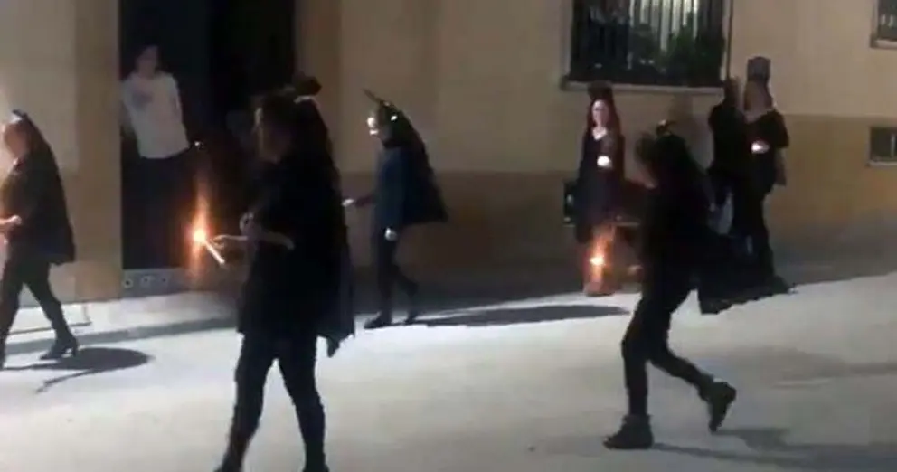 En el vídeo que circula viralmente por redes sociales se observa un grupo de nueve mujeres con ropa oscura, cartón de peineta y bolsas de basura en la cabeza para simular ser mantillas andando por una calle, una al frente con lo que parece un palermo emulando ser la fiscal que ordena la procesión y el resto repartidas en dos filas detrás de ella portando velas encendidas.