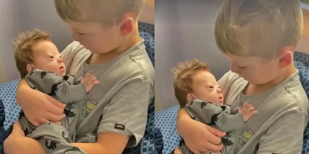 En el vídeo se puede observar como un niño tiene en sus brazos a un recién nacido, su hermano, que tiene síndrome de Down.