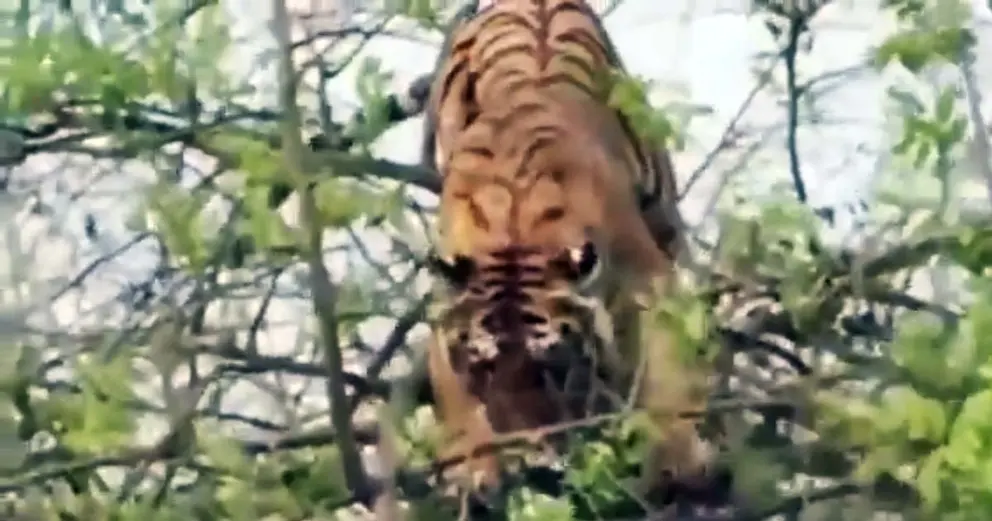 Un tigre cae desde la copa de un árbol al intentar cazar un mono