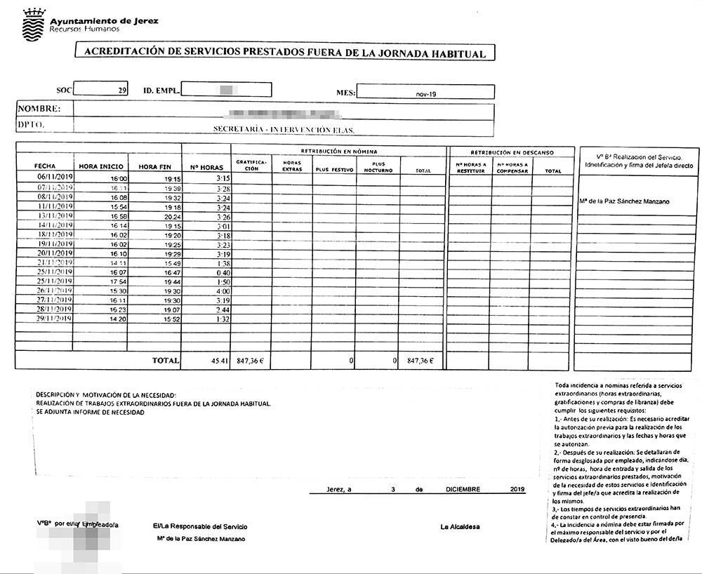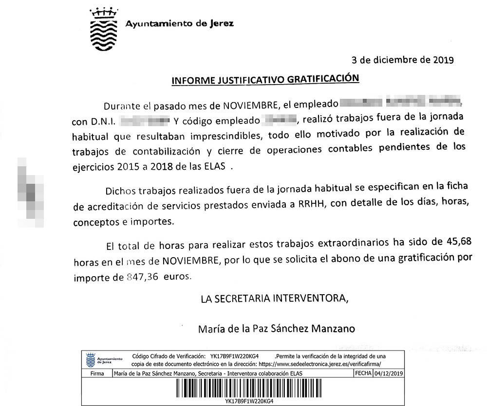 En el documento firmado por la Secretaria Interventora que depende de Mamen Sánchez, se informa que "durante el pasado mes de noviembre, el empleado R.R. realizó trabajos fuera de la jornada habitual que resultaban imprescindibles, todo ello motivado por la realización de trabajos de contabilización y cierre de operaciones contables pendientes de los ejercicios 2015 a 2018 de las pedanías de Jerez".