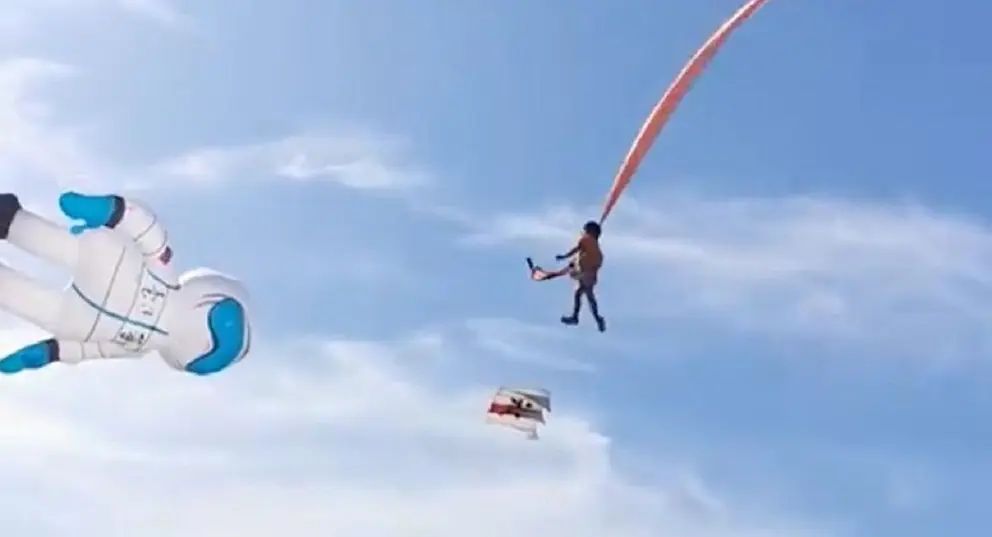 Tremendo susto durante una exhibición de cometas en Taiwan. Una niña de tres años sale volando detrás de su cometa tras producirse una fuerte ráfaga de viento y quedar atada con las cuerdas en la cintura.