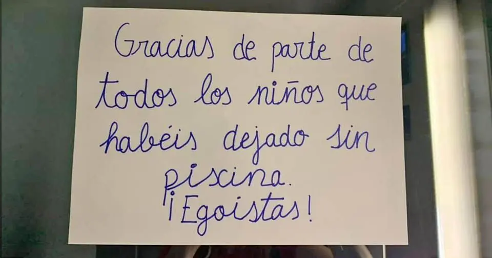 El mensaje posteado por Carmela Vázquez, quien ha fotografiado un cartel encontrado en el ascensor de su edificio, señala la impotencia de las familias con niños de la Urbanización Nuevo Chapín Segunda Fase al recibir la noticia de que este verano la piscina comunitaria permanecerá cerrada por decisión de la mayoría de vecinos. La urbanización la componen 12 bloques, con gran cantidad de pequeños y pequeñas, y se trata de una decisión para todo el verano.