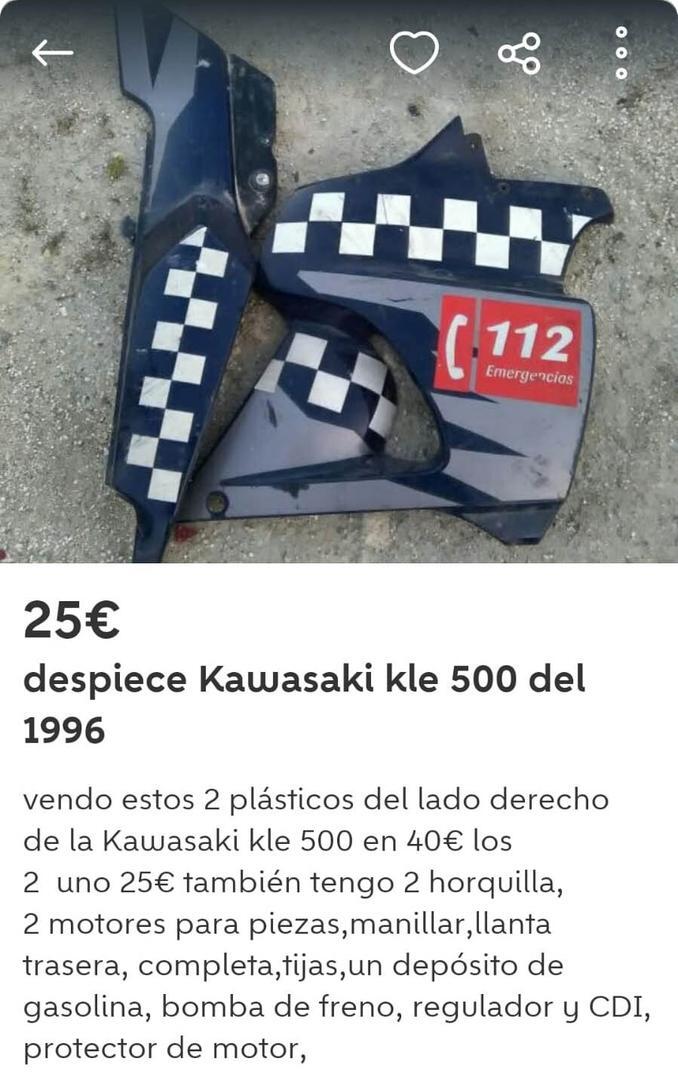 Un usuario, identificado como Miguel G., ha colocado este dos de agosto una oferta en Wallapop de diferentes piezas de una motocicleta Kawasaki KLE 500 del año 1996. Lo curioso en este caso, es que se tratan de partes de una motocicleta municipal, concretamente de la Policía Local de Jerez de la Frontera.