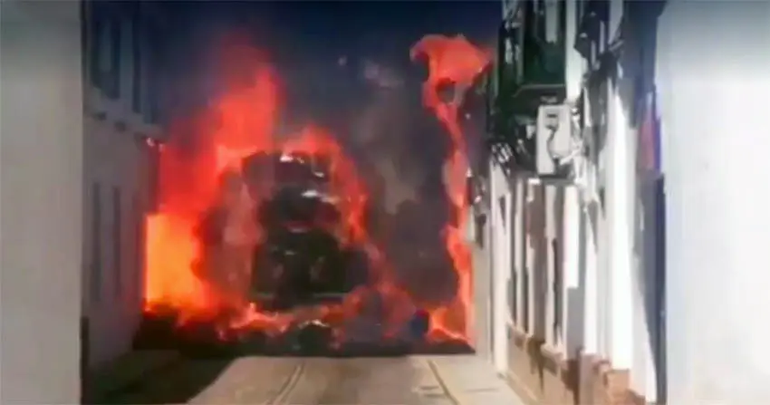 Un camión cargado de paja ha prendido en llamas tras tocar en su parte alta un cable de alta tensión, provocando fuego de gran altura y una columna de humo visible desde varios kilómetros de distancia.